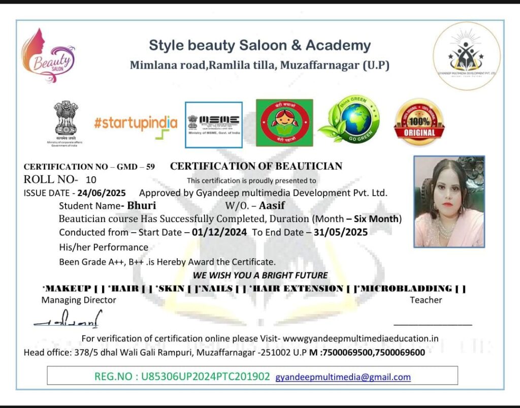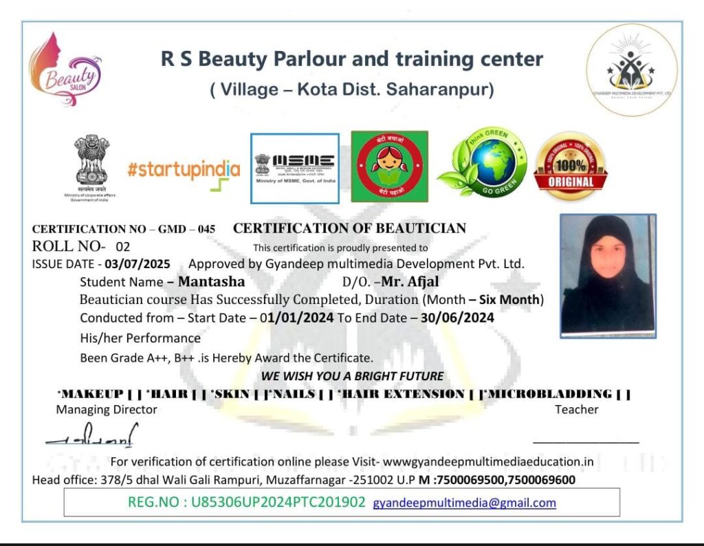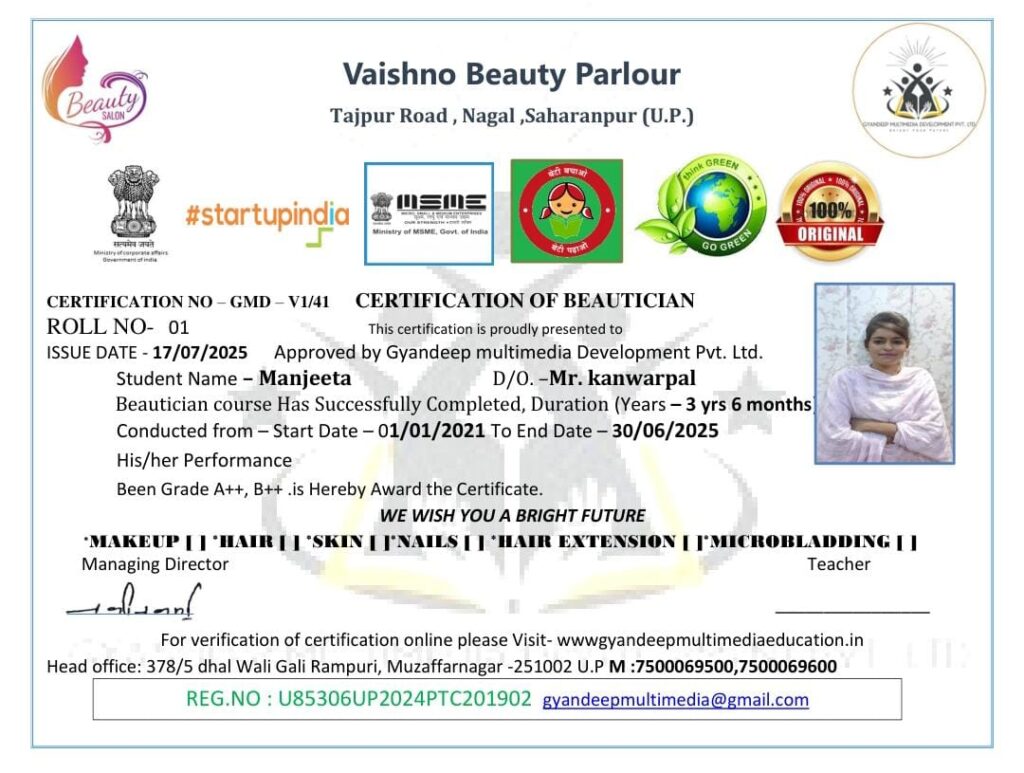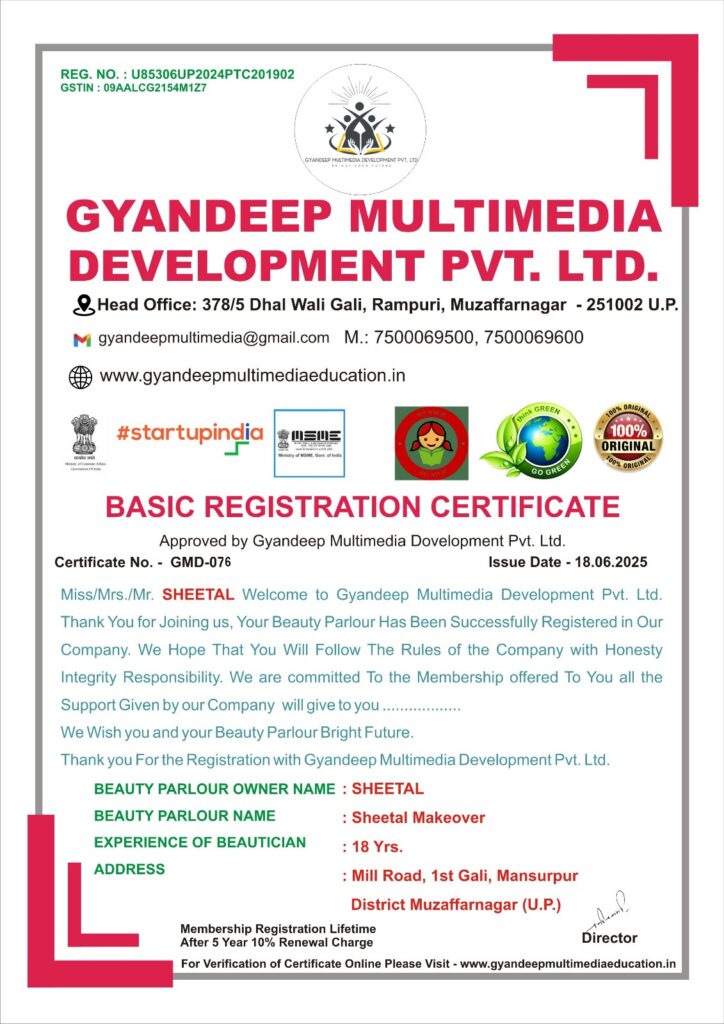 Parlour name – Sheetal Makeover Address- Mill road ,1st Gali ,Mansurpur , Muzaffarnagar experience – 18 yrs
