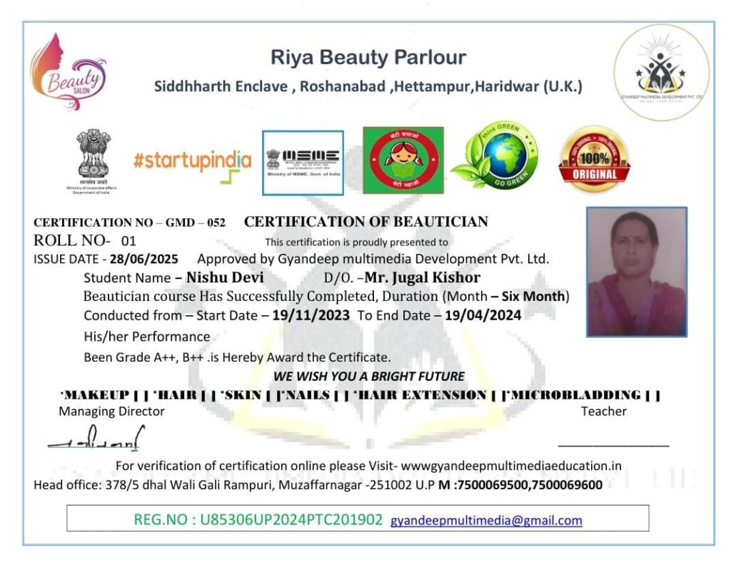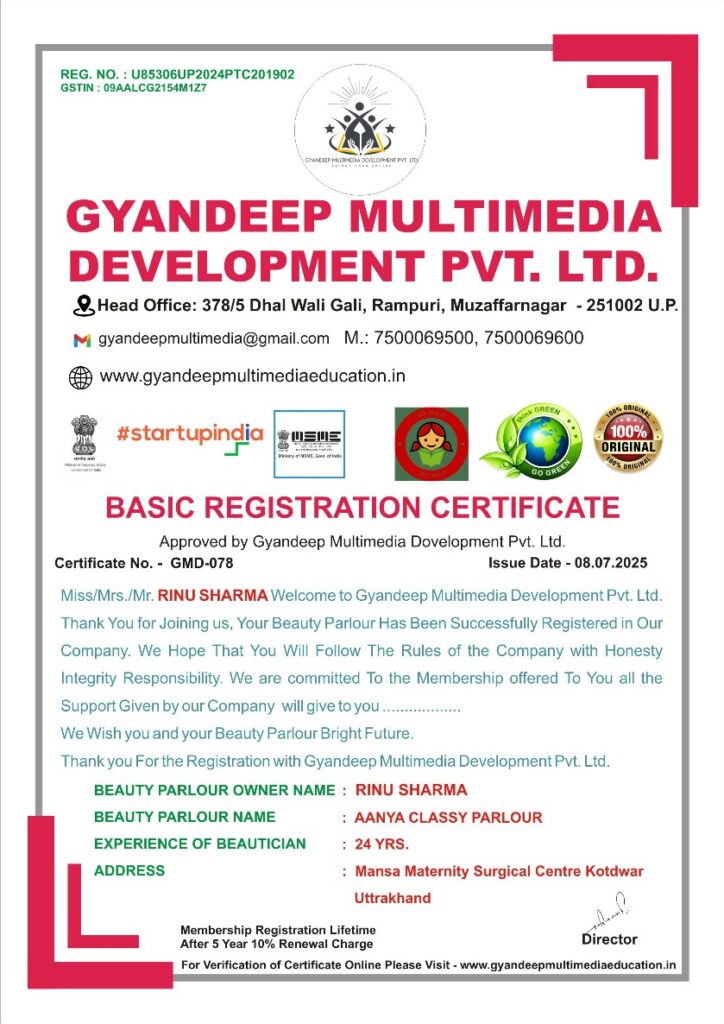 Parlour Name- Aanya Classy Parlour Parlour Experience- 24 Years Address-Mansa Maternity Surgical Centre Kotdwar Uttrakhand