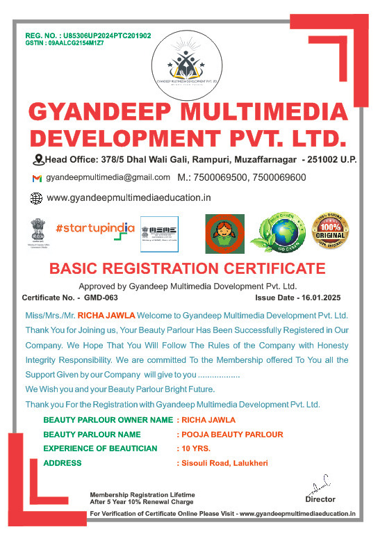Parlour Name – Pooja Beauty Parlour Address – Sisouli Road , Lalukheri, Muzaffarnagar (U.P..)