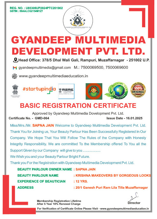 Parlour Name -Krishna Makeover By Gorgeous Looks Address -20/1, Ganesh Puri ,RamLila Tilla ,Muzaffarnagar (U.P.)
