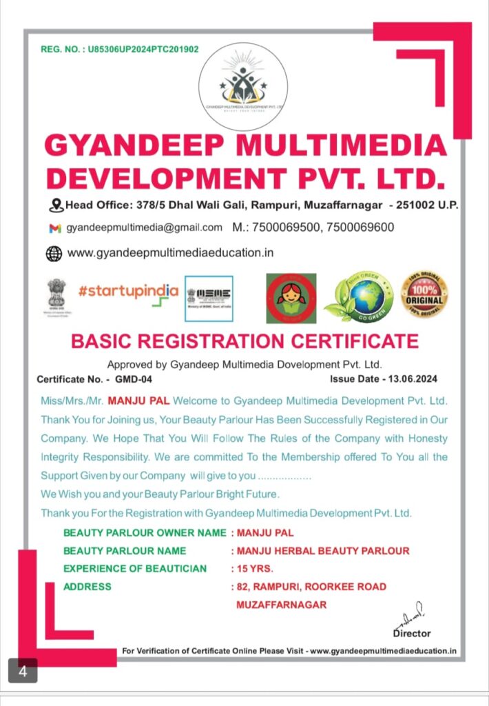 Parlour name – Manju Herbal Beauty parlour Address – 82 Rampuri Roorkee road Muzaffarnagar ( U.P.)