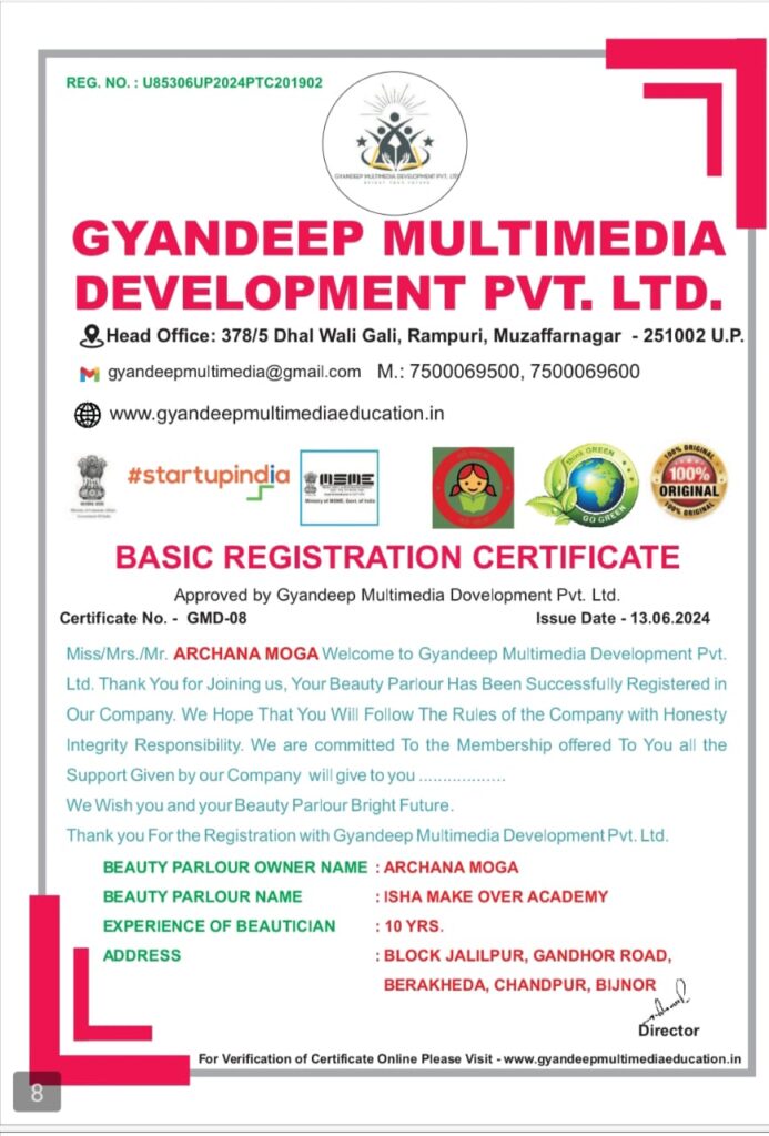 Parlour name – Isha Make over Academy Address – Block Jalilpur, Gandhor road, Berakheda, Chandpur ,Bijnor (U.K.)