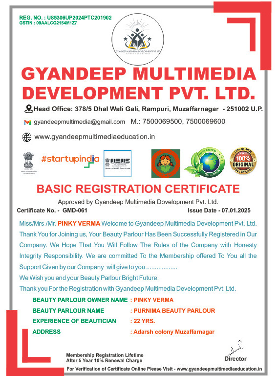 Beautician Name – Pinky VermaBy Gyandeep / March 14, 2025 Parlour Name – Purnima Beauty Parlour Address- Adarsh Colony ,Muzaffarnagar (U.P.