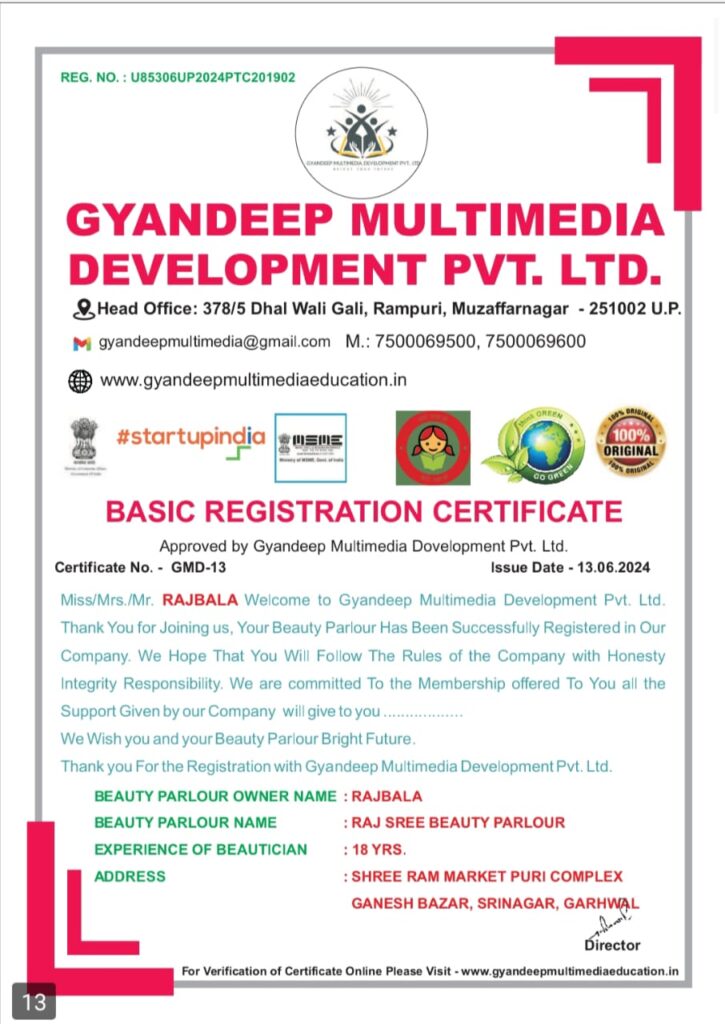Beautician name – RajbalaBy Gyandeep / March 12, 2025 Parlour name – Raj Sree Beauty Parlour Address- Shree Ram Market Puri complex, Ganesh Bazar, Shrinagar, Garhwal