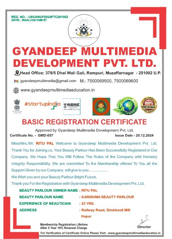 Beautician Name -Ritu PalBy Gyandeep / March 14, 2025 Parlour Name – Karishma Beauty Parlour Address – Railway Road, Simbhaoli Mill, Hapur , (U.P.)